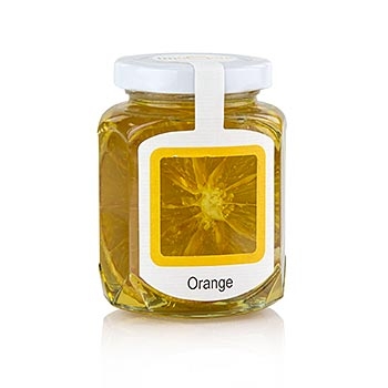 Honigzubereitung aus aromaisiertem Akazienhonig mit Orange. Zutaten: 99% Akazienhonig, 1% getrocknete Orange, natürliches Aroma. Bei Kristallisation bzw. Trübung langsam im Wasserbad bis maximal +40°C verflüssigen.