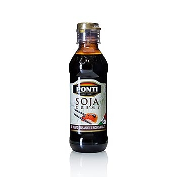 Soja Creme mit Aceto Balsamico. Zutaten: 38% Sojasauce (Wasser, SOJABOHNEN, WEIZEN, Salz), gekochter Traubenmost, 25% Aceto Balsamico die Modena I.G.P. (Weinessig, konzentrierter Traubenmost, gekochter Traubenmost, Farbstoff: E150d, Antioxidationsmittel: SCHWEFELDIOXID), modifizierte Maisstärke, Verdickungsmittel: Xanthan. Hergestellt in Italien.