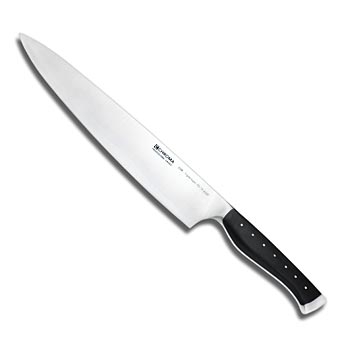 Die Chroma TrippleC - Serie ist vom Londoner Stardesigner Sebastian Conran gemeinsam mit Köchen der D&D London (ehemals Conran) Restaurants entwickelt worden. Dabei sind ästhetisch ansprechende und absolut praxisorientierte Chefmesser entstanden. Sie besitzen einen scharfen japanischen "V"-Schliff und sind für ihre überragende Schärfe erstaunlich robust. Der Griff aus hochwertigem Kunststoff liegt sicher in der Hand und ermöglicht ermüdungsfreies Arbeiten. Die Klinge ist aus einer inneren Lage mit sehr hartem Stahl (VG14/59°HRC) und zwei schützenden, äußeren Lagen aus weicherem Stahl hergestellt. Die Schneide bleibt sehr lange scharf und lässt sich einfach und schnell z.B. mit dem CHROMA Schleifstein ST-1800 (240/1000er Körnung) nachschleifen.