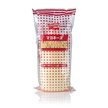Japanische Mayonaise. Zutaten: SOJAÖL, EIGELB, Essig, Wasser, Salz, Zucker, SENF, Geschmacksverstärker: E621, E635, Emulgator: E385, SENFEXTRAKT. Nach dem Öffnen gekühlt aufbewahren und zügig verbrauchen.