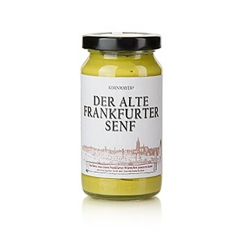 Der Alte Frankfurter Senf ist mittelscharf und mit Zwiebelstückchen und Gewürzen abgeschmeckt.