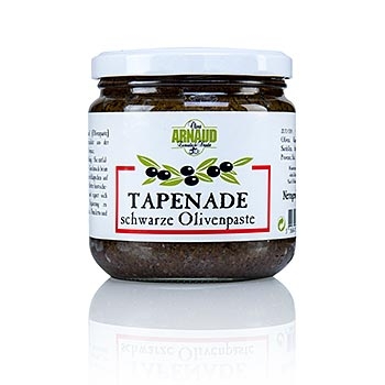 Schwarze Olivenpaste. Zutaten: Oliven, Kapern, Olivenöl, SARDELLEN, Thymian aus der Provence, Salz. Nach dem Öffnen kühl lagern. Hergestellt in Frankreich.