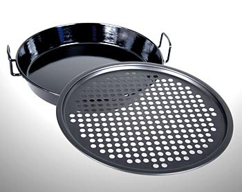 Das 2-teilige Gourmet-Set umfasst eine Universalpfanne Ø 34cm und ein Pizzablech Ø 35cm. In der Universalpfanne lassen sich Pizza, Risotto, Kuchen oder Gemüsepfannen zubereiten. Mit dem Pizzablech gelingen auch auf dem Grill die leckersten Gebäcke: Pizza, Quiche, Strudel, Aperogebäck, Brot oder auch Fisch und Gemüse. Das Blech ist auch für Tiefkühlprodukte geeignet. Das Zubehör ist aus emallierten Stahl gefertigt und leicht zu reinigen. Passend für Outdoorchef Gaskugelgrill City (Art. 21872).