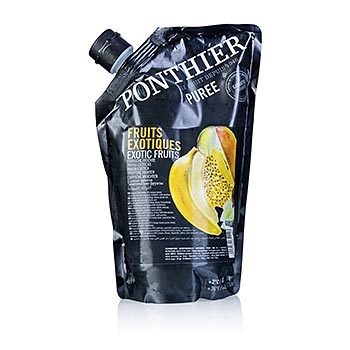 Die Fruchtpürees von Ponthier zeichnen sich durch ihre besonders intensive Farbe und den authentischen Geschmack aus. Ponthier bietet mit seinen Produkten eine Qualität, die für die gehobene Küche unerlässlich ist. Einfach lecker für Torten, Gebäck, Dessert oder Eis. Exoten-Mix wird aus Mango, Banane, Maracuja und Limetten hergestellt.
