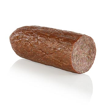 Diese Auersbacher Salami ist eine gereifte Rohwurst mit Kürbiskernen. Die Vulcano Schinkenmanufaktur, im Steierischen Vulkanland, produziert schmackhafte Spezialitäten vom Schwein. Lange Reife, ausgewogene Würzung und Rauch, machen es hier möglich, den feinen Geschmack des Fleisches zur Geltung zu bringen, indem weit über 100 Aromen enthalten sind. Die Vulcano Schweine können artgerecht wühlen, suhlen und laufen und werden mit verschiedenen Getreiden gefüttert, bis zur Schlachtreife von 180 kg.
